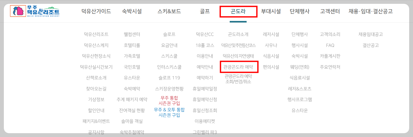 덕유산케이블카(곤돌라)를 예약하시려면 먼저 무주리조트 홈페이지에 접속해 주세요