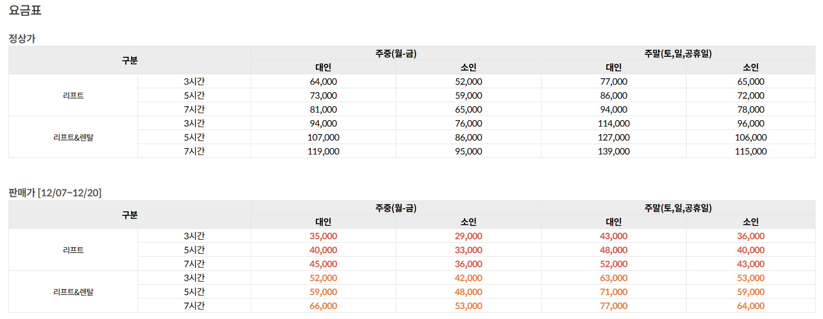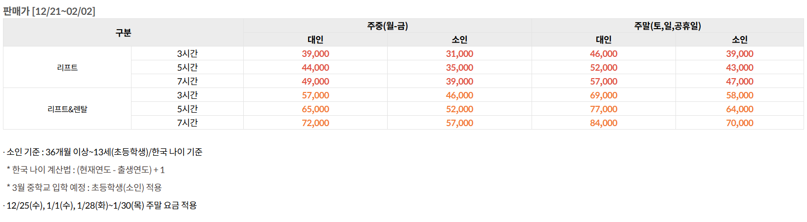 리프트 이용권 종류 및 요금 안내
