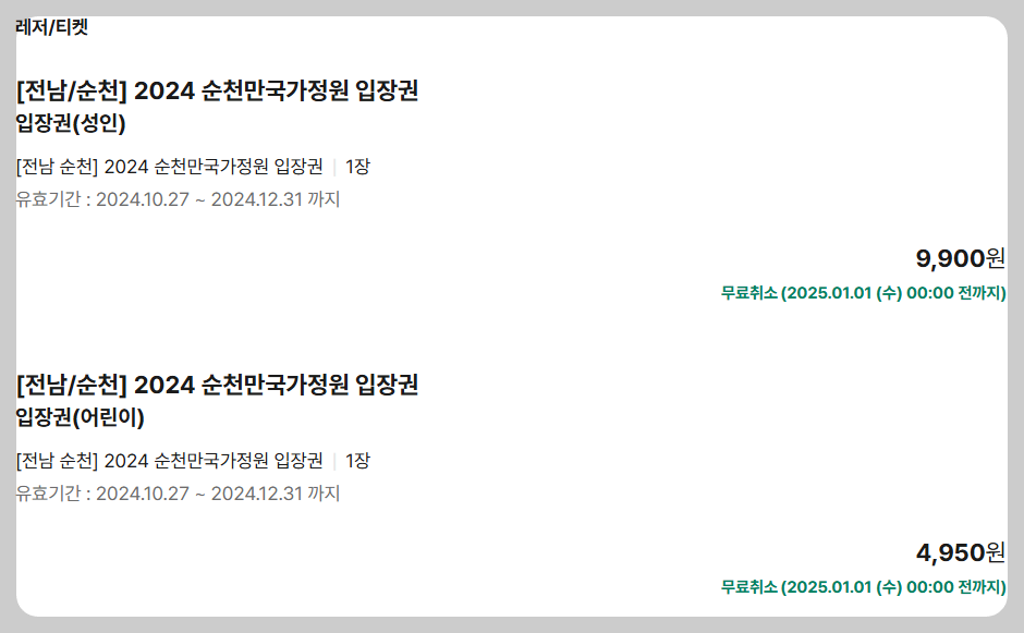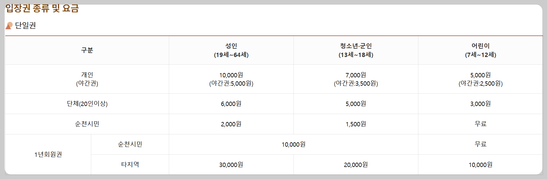 일반 입장권 외에도 야간권, 단체권, 순천 시민 할인권 등이 있어 다양한 선택이 가능합니다.