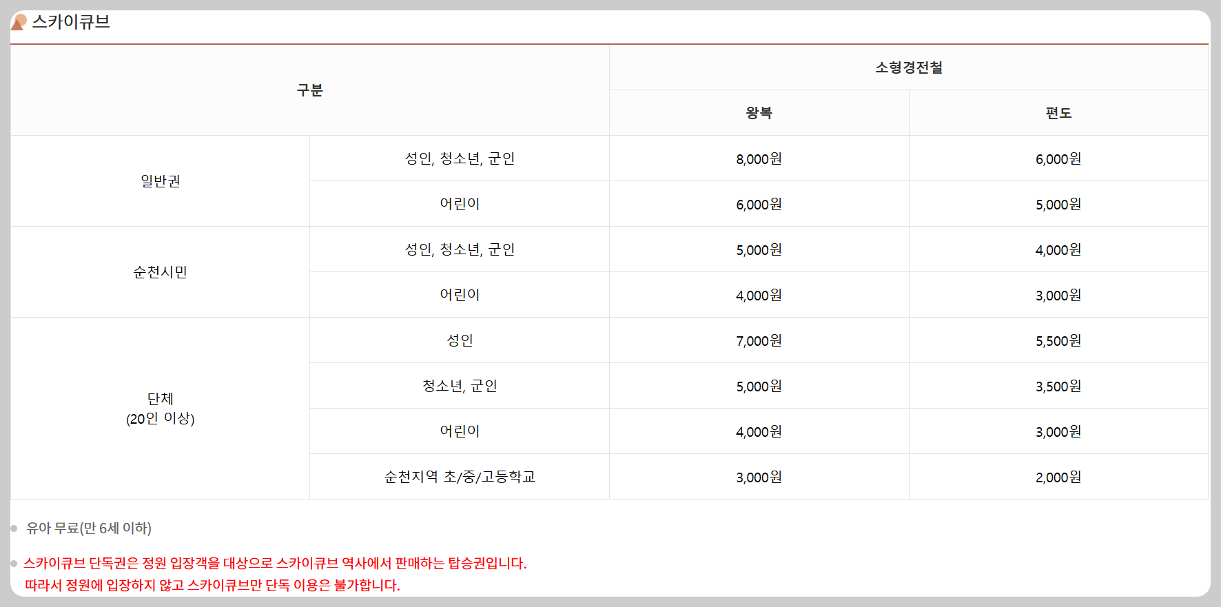 스카이큐브 왕복 이용료는 성인 8,000원, 어린이 6,000원이며 순천 시민은 추가 할인이 적용됩니다.