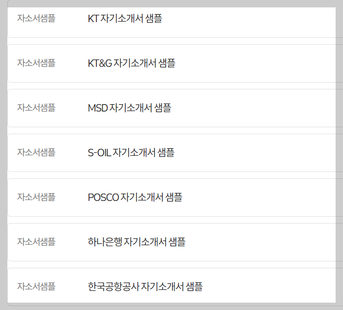 한번도 자기소개서를 작해보지 않았다면 자기소개서 샘플을 보고 연습해보는것도 좋은 방법입니다.