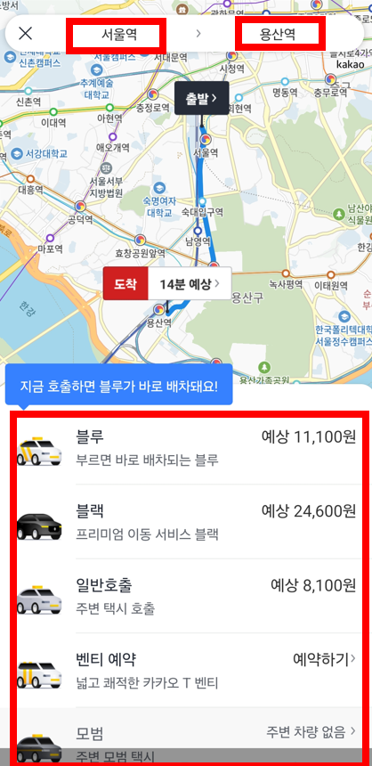 - 일반택시와 블루 택시가 화면에 나타나게 됩니다. 블루택시는 요금이 비싸니 급하지 않으시다면 일반택시를 호출하세요.