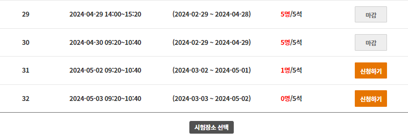 - 시험장소 확인 마감되지 않은 곳에 신청하시면 됩니다.