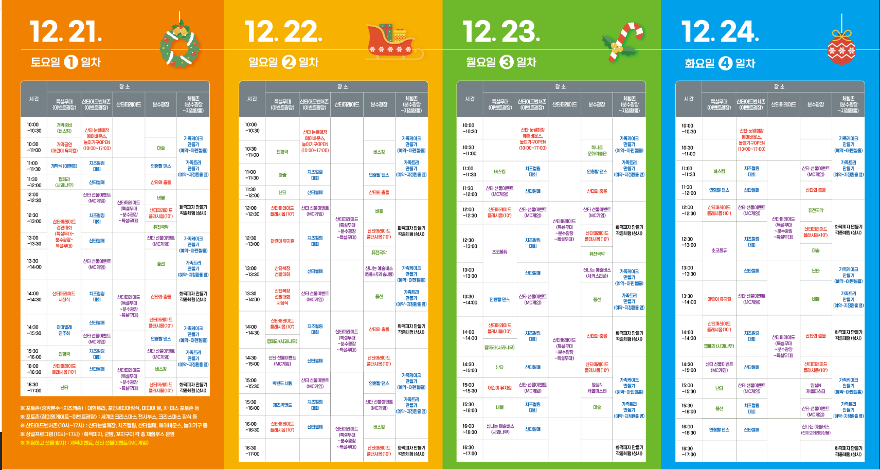 | 특별 이벤트 | 산타 퍼레이드, 치즈 컬링, 포토존 |