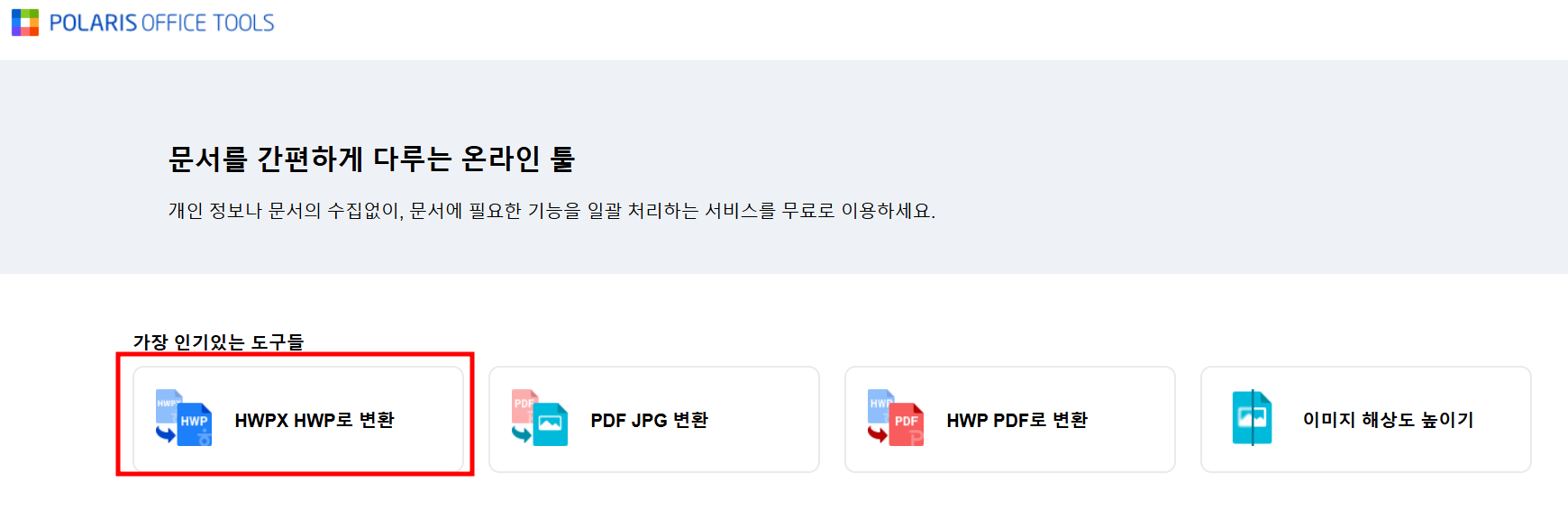 - 'HWPX를 HWP로 변환' 옵션 선택: 웹사이트 메인 페이지에서 'HWPX를 HWP로 변환' 옵션을 찾아 클릭합니다. 이 옵션은 보통 메인 메뉴나 인기 도구 섹션에서 쉽게 찾을 수 있습니다.