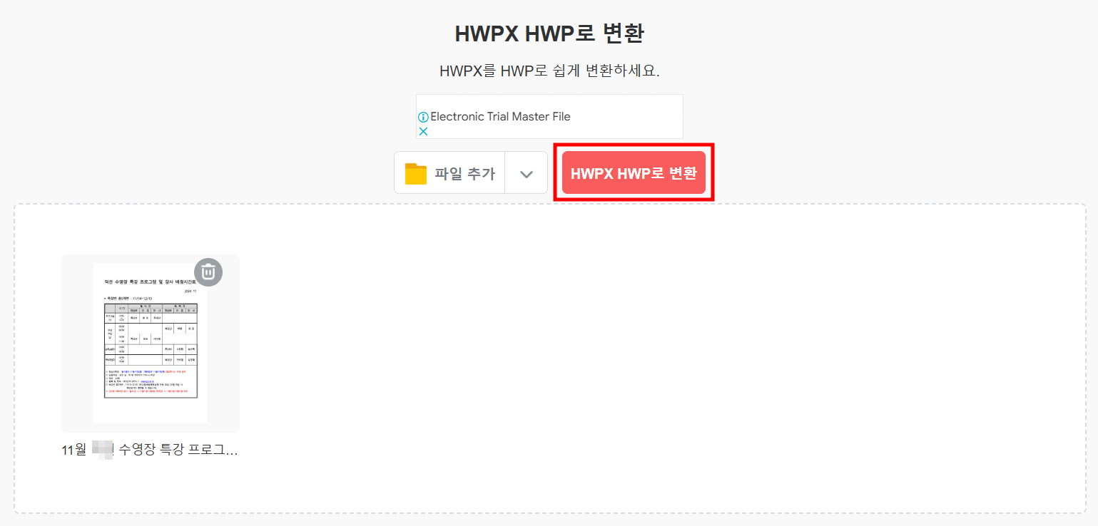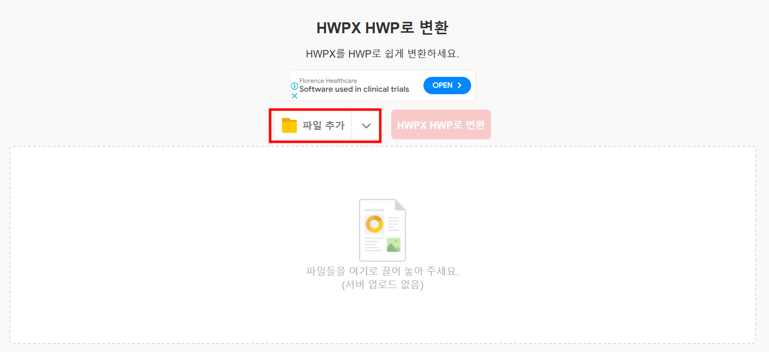 - 파일 업로드: '파일 선택' 또는 '파일 추가' 버튼을 클릭하여 변환하고자 하는 HWPX 파일을 선택합니다. 또는 파일을 드래그 앤 드롭하여 업로드할 수도 있습니다.